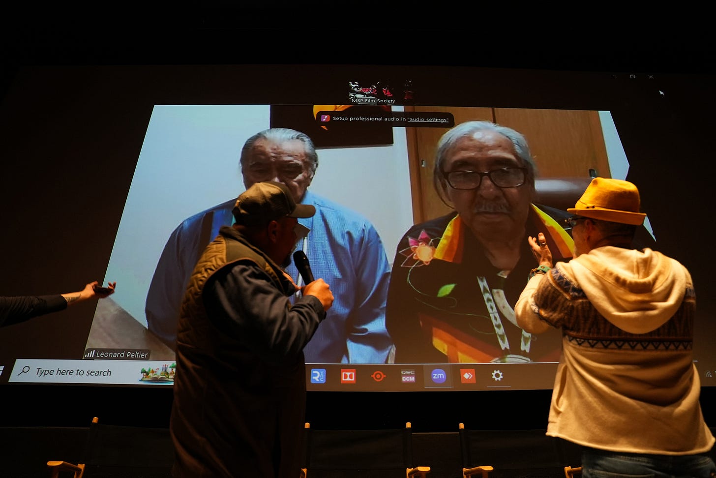 The highlight of the evening was after the film. The filmmakers came up to share about their project, and then they introduced a couple of special guests via Zoom call: Dino Butler (a friend of Peltier’s who was also accused but acquitted of the killings) and Leonard Peltier himself, whose double-life sentence was commuted by President Biden just 16 minutes before his term ended. Peltier is under home confinement, and this was one of the first times he had spoken to a public audience since his release. It was a very special thing to hear directly from him after witnessing a summary of his life and plight.